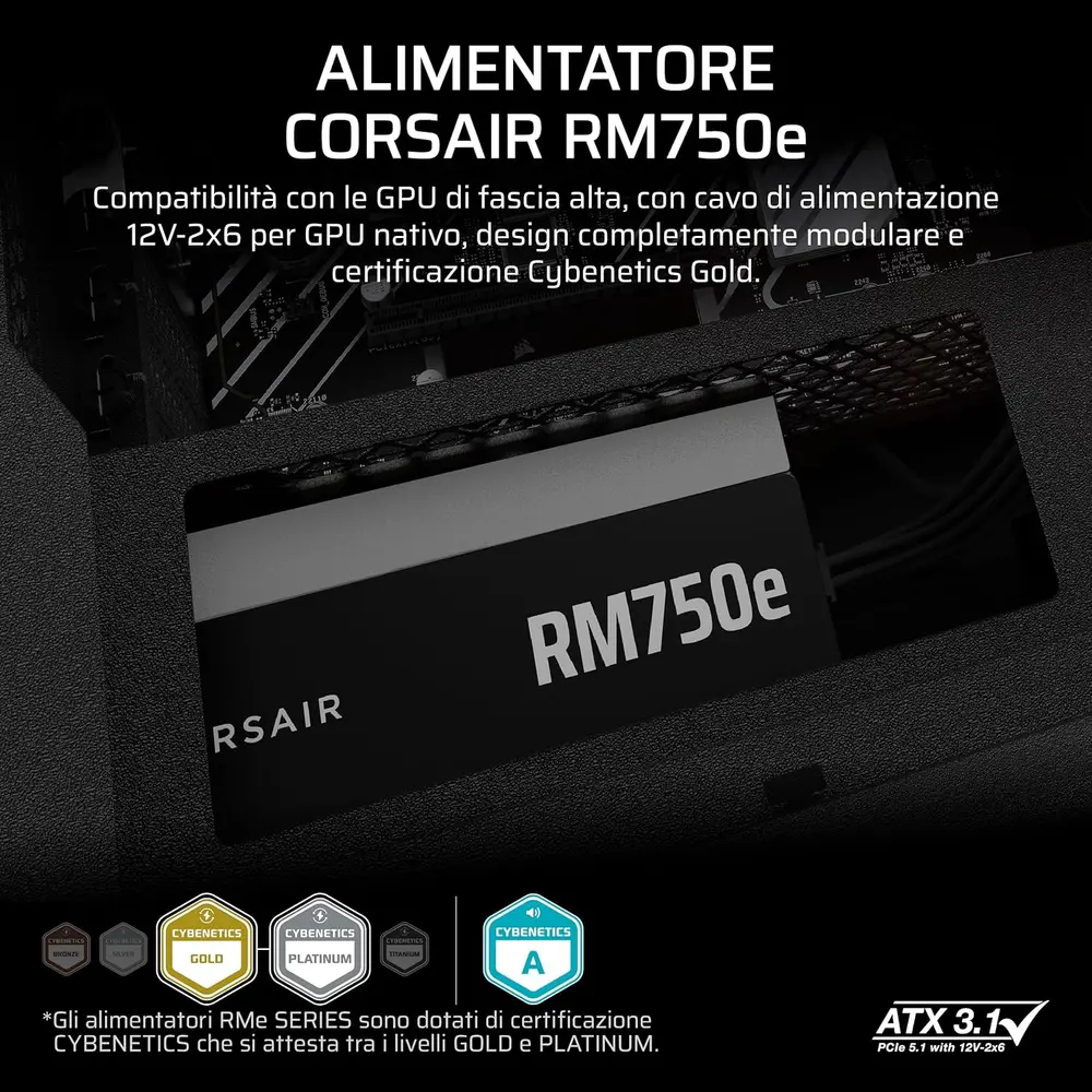 Il CORSAIR RM750e (2025) è l’alimentatore ATX completamente modulare progettato per offrire un’alimentazione silenziosa, affidabile ed estremamente efficiente al tuo PC desktop. Grazie alla conformità con i più recenti standard ATX 3.1 e PCIe 5.1, questo PSU è già pronto per le schede grafiche di nuova generazione, includendo il connettore nativo 12V-2×6 per alimentare le GPU più esigenti senza la necessità di adattatori ingombranti. La certificazione Cybenetics Gold garantisce un consumo energetico ridotto e un funzionamento termico ottimale.