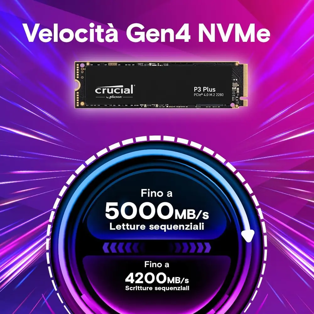 Perfetto per utenti che desiderano migliorare drasticamente le prestazioni del proprio sistema, il Crucial P3 Plus garantisce avvii rapidi, caricamenti fulminei e una gestione affidabile dei dati. Ideale per aggiornamenti o nuove build.